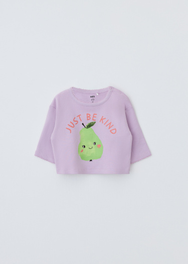 Трикотажный лонгслив с набивным принтом. Прямой крой, круглый рельефный вырез, спущенное плечо. Боковая застежка на две кнопки у ворота.