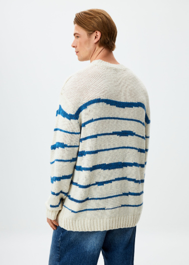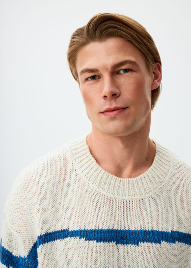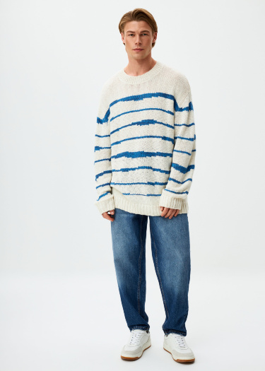 Вязаный джемпер оверсайз с контрастным рисунком в виде неравномерной полоски. Круглый вырез горловины. Спущенная линия плеча. Рельефные низ изделия и рукавов.