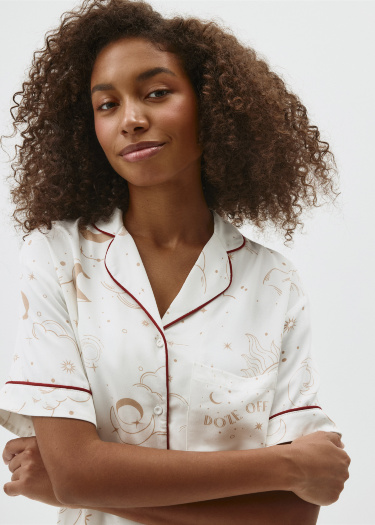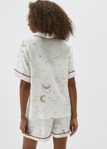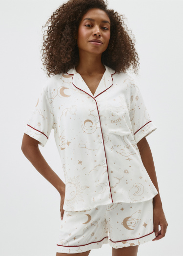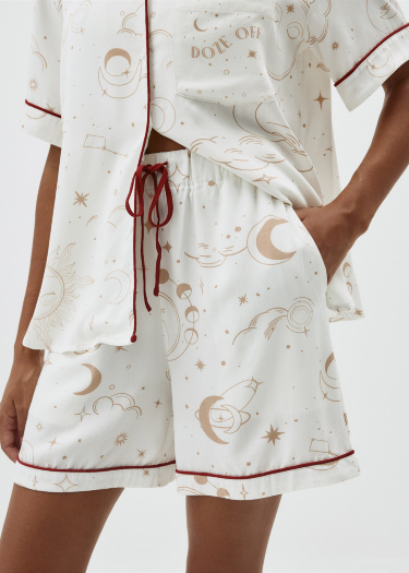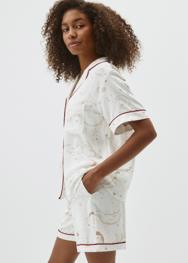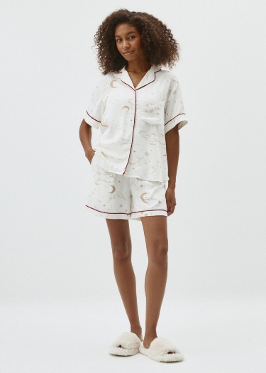 Новогодняя пижама, состоящая из рубашки и шорт с тематическим принтом. Мягкая вискозная ткань. Рубашка прямого кроя с английским воротником, короткими рукавами и застежкой на пуговицы. Один нагрудный карман и декоративный контрастный кантик на воротнике, манжетах и вдоль планки. Короткие шорты со средней посадкой талии, эластичным поясом с кулиской и карманами с отрезным бочком. Новогодняя коллекция. На модели представлен размер S. Параметры модели: 175/80/60/89.
