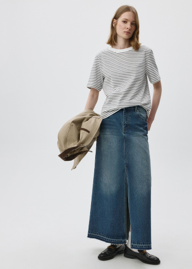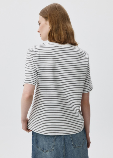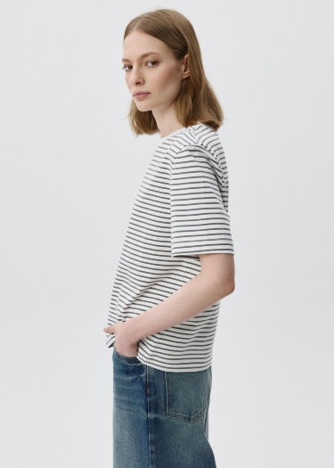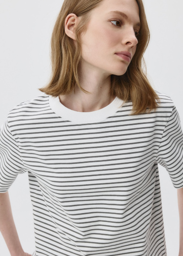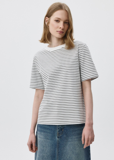 Футболка оверсайз в полоску из плотного хлопкового трикотажа. Свободный крой со спущенным плечом. Круглый вырез горловины в рубчик. Короткий рукава. На модели размер S. Параметры модели: 78/58/88, рост 177.